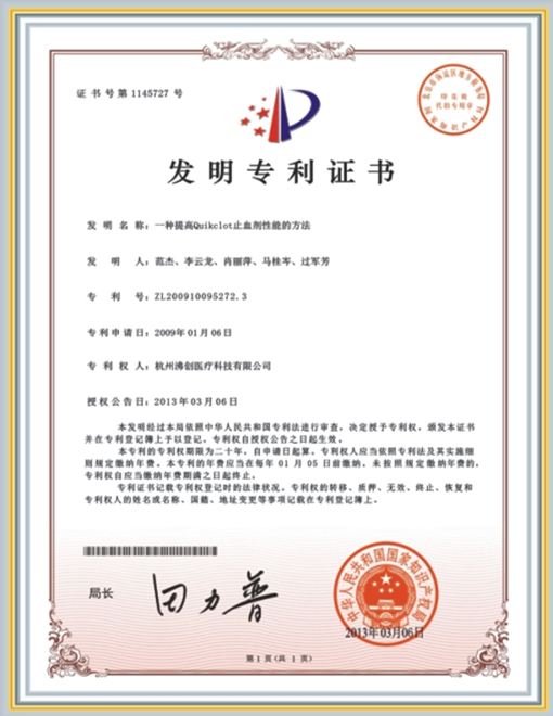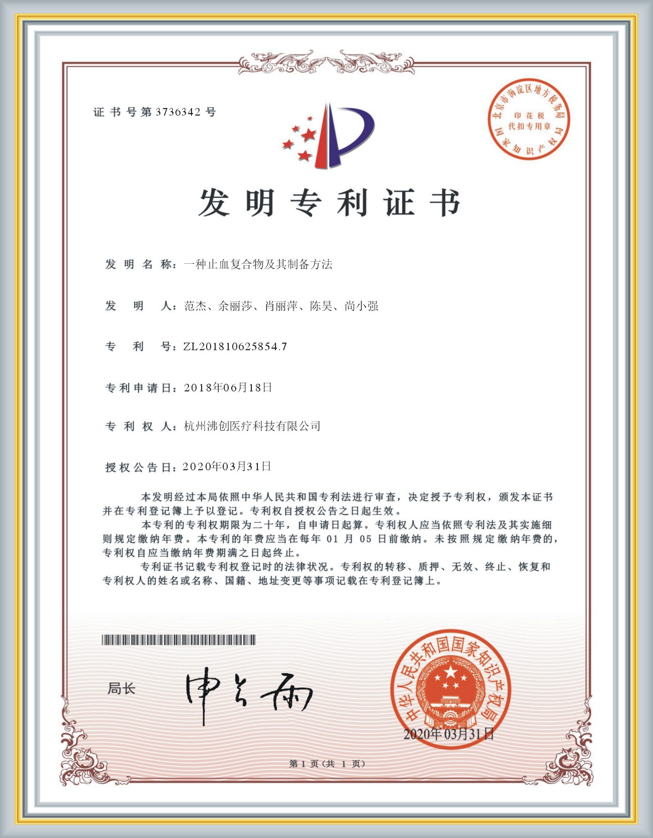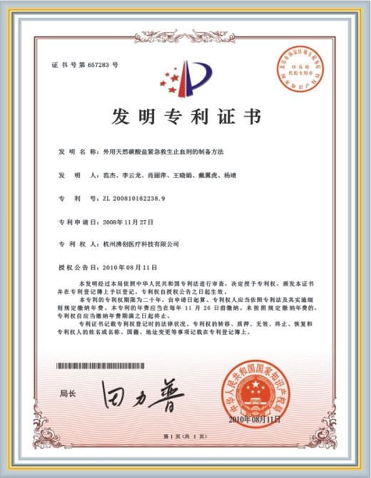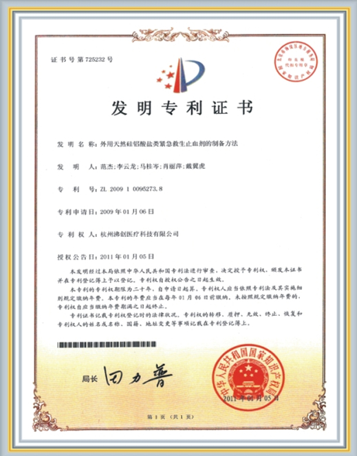 公司“第一代沸石止血技術”獲得發(fā)明專利